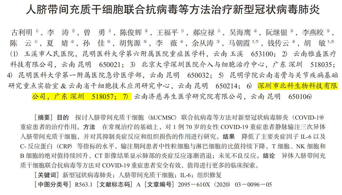 在疫情期間,北科生物也積極參與技術(shù)攻關(guān),與云南多家醫(yī)療機(jī)構(gòu)聯(lián)合開(kāi)展的間充質(zhì)干細(xì)胞治療新冠肺炎危重癥患者的臨床研究也已取得階段性成果,并發(fā)表《人臍帶間充質(zhì)干細(xì)胞聯(lián)合抗病毒等方法治療新型冠狀病毒肺炎》文章。