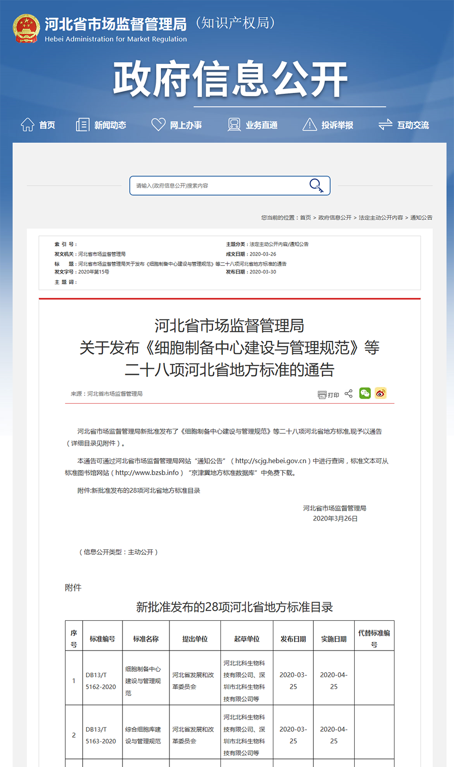 3月25日,河北省市場監(jiān)督管理局發(fā)布通知,《細胞制備中心建設與管理規(guī)范》(編號:DB13/T5162-2020)、《綜合細胞庫建設與管理規(guī)范》(編號:DB13/T5163-2020)正式批準發(fā)布,將于4月25日正式實施。兩項標準是河北省標準化體系建設的重要組成部分之一,由河北省市場監(jiān)督管理局組織,河北省發(fā)展和改革委員會提出,河北北科生物科技有限公司,深圳市北科生物科技有限公司、個體化細胞治療技術國家地方聯(lián)合工程實驗室(深圳)共同編制完成。