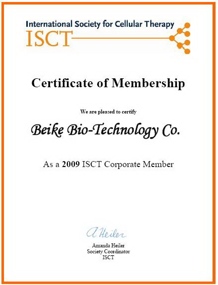 2009年8月,北科生物獲得國(guó)際細(xì)胞治療協(xié)會(huì)(International Society for Cellular Therapy,ISCT)會(huì)員資格,并獲得了該協(xié)會(huì)頒發(fā)的會(huì)員證書(shū),成為該機(jī)構(gòu)的正式會(huì)員。