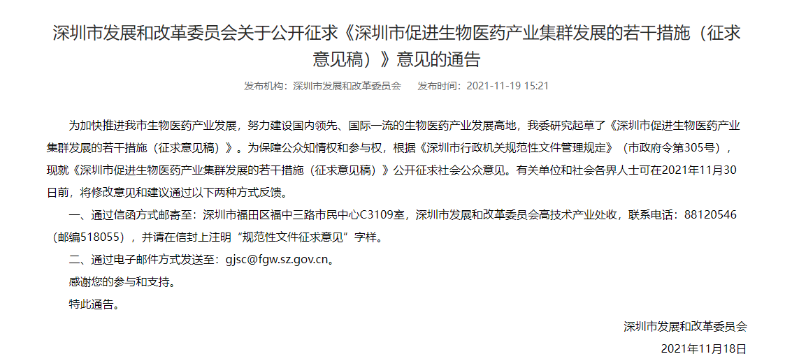 近日,為落實《中共中央 國務(wù)院關(guān)于支持深圳建設(shè)中國特色社會主義先行示范區(qū)的意見》《深圳市關(guān)于進一步加快發(fā)展戰(zhàn)略性新興產(chǎn)業(yè)的實施方案》(深府〔2018〕84號)等政策精神,充分銜接《深圳市促進生物醫(yī)藥產(chǎn)業(yè)集聚發(fā)展指導意見》及相關(guān)配套文件(深府辦〔2020〕2號),加快推進我市生物醫(yī)藥產(chǎn)業(yè)發(fā)展,努力建設(shè)國內(nèi)領(lǐng)先、國際一流的生物醫(yī)藥產(chǎn)業(yè)發(fā)展高地,深圳市發(fā)改委研究起草了《深圳市促進生物醫(yī)藥產(chǎn)業(yè)集群發(fā)展的若干措施(征求意見稿)》。