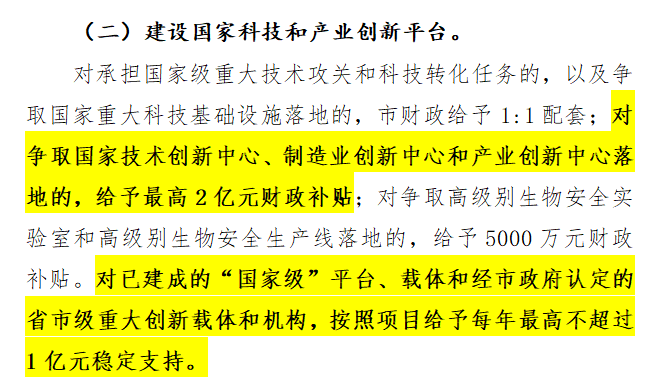 對承擔國家級重大技術(shù)攻關(guān)和科技轉(zhuǎn)化任務(wù),以及爭取國家重大科技基礎(chǔ)設(shè)施落地的給予財政補貼。